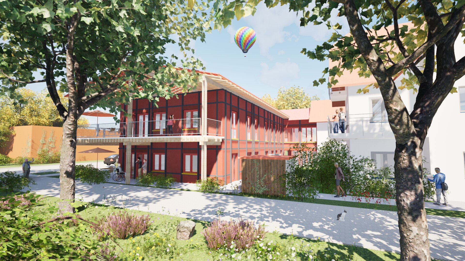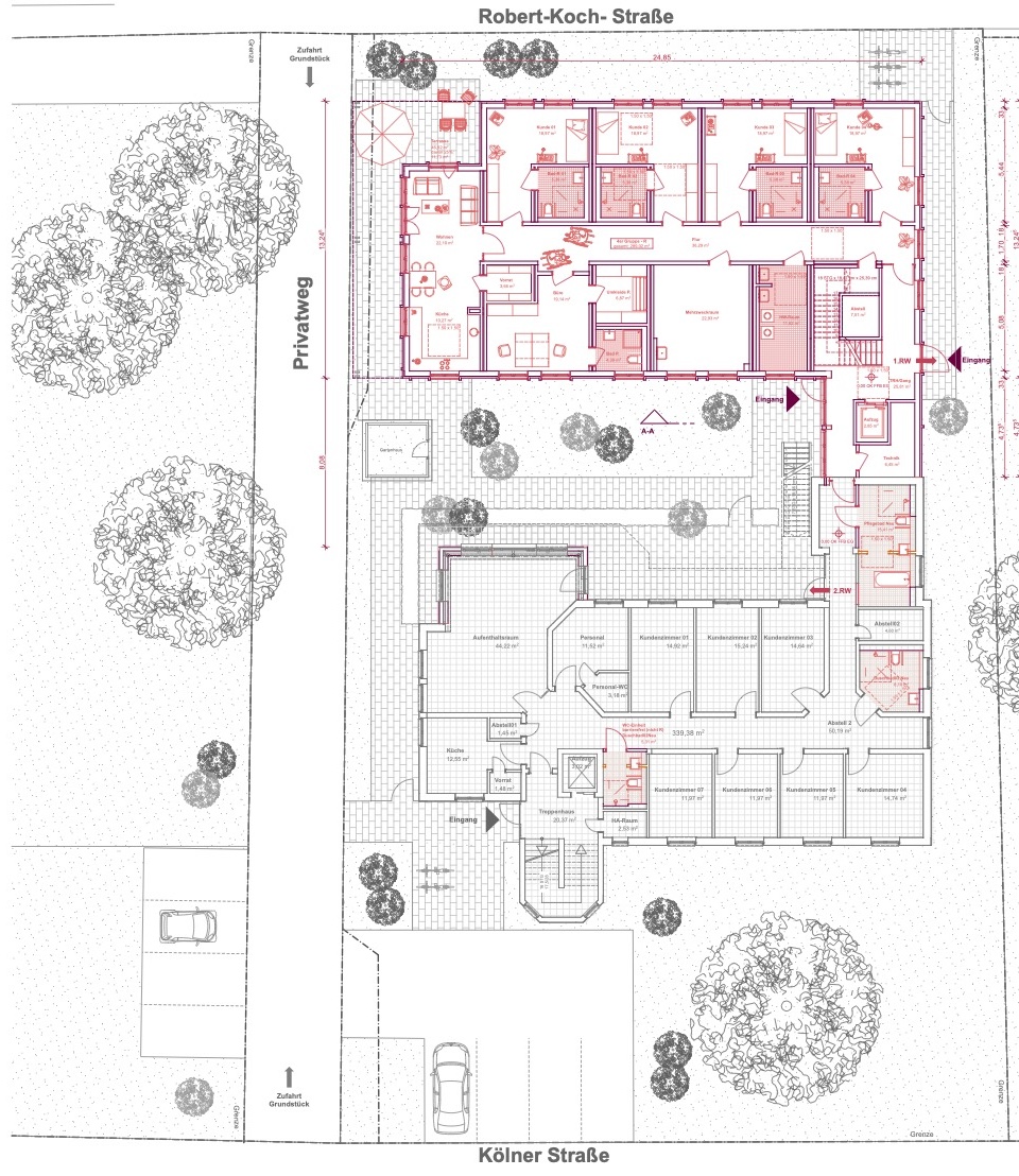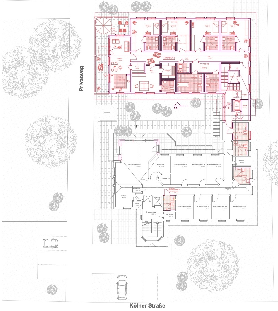 Für ein Wohnheim für Menschen mit Behinderungen planen wir einen Erweiterungsbau mit zwei Wohngruppen für jeweils vier Personen.