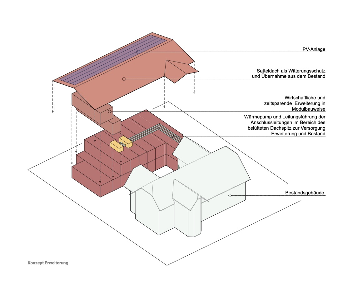 Um den laufenden Betrieb möglichst wenig zu beeinträchtigen und das Außengelände frei zu halten, wird das Gebäude in Holzmodulbauweise errichtet. Bereits im Vorentwurf orientiert sich der Grundriss am wirtschaftlichsten Modulmaß – dies ermöglicht eine effiziente Planung und hohe Kostensicherheit.