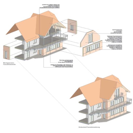 Die energetische Sanierung, die Erweiterung und die Aufstockung sind in Holztafelbauweise geplant. Diese Bauweise bietet nicht nur energetische Vorteile, sondern ermöglicht es auch, die Gebäudetechnik wirtschaftlich in den vorgefertigten Fassadenelementen zu integrieren. Die Versorgung des Gebäudes erfolgt durch regenerative Energien.
